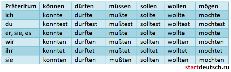 Таблица спряжения модальных глаголов в прошедшем времени Präteritum