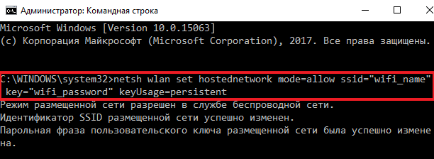 После выполнения указанной команды в командной строке должно появиться сообщение о разрешении режима размещенной сети, а также об изменении SSID и парольной фразы.
