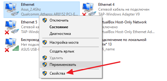 В контекстном меню «Ethernet», выбираем «Свойства»,