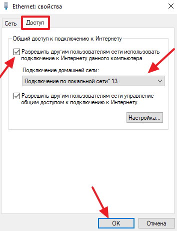 Входим во вкладку «Доступ», Ставим галочку Разрешить доступ пользователям… и выбираем нашу созданную сеть Подключение по локальной сети 2.