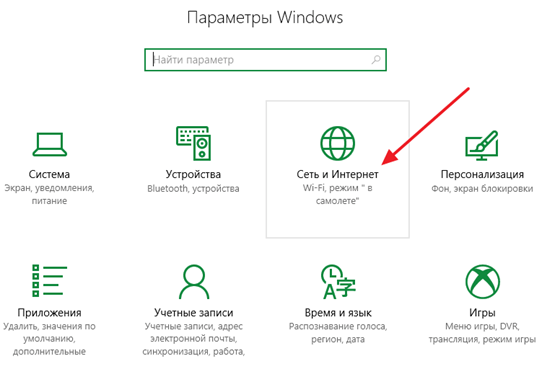 В окне «Параметры» сразу переходим в раздел «Сеть и Интернет».