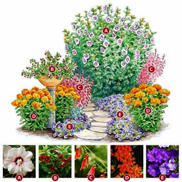 Интересно выглядит душистый цветник из гибискуса, куфеи, пенстемона, ваточника и петунии, схема которого приведена далее:
