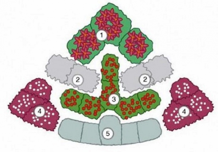 1 - Жимолость-каприфоль (Lonicera caprifolium), 2 - Роза плетистая (Rosa х hybr. climbing), 3 - Роза бедреицеволистная (Rosa pimpinellifolia), 4 - Пион садовый (Paeonia х hybr.), 5 – Лилия королевская (Lilium regale).