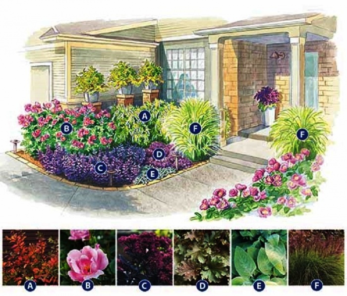 Пример удачного украшения входа на дачу представлен на следующей схеме, где в оформлении клумбы использованы розы, петуньи, туя, дельфиниум, лилии, астры и манжетка: