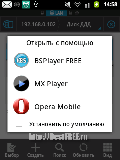 Нажимаем на иконку найденного ПК и получаем список папок, доступных для просмотра в локальной сети. Открываем нужную, и жмем фильм, который хотим посмотреть. Откроется окошко выбора приложения, при помощи которого мы хотим посмотреть файл: