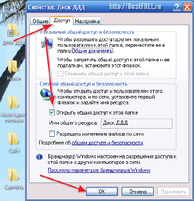 В открывшемся окошке свойств нам будет достаточно отметить пункт «Открыть общий доступ к этой папке» и нажать «Ok». Если вдруг перед Вами появится окно, сообщающее о том, что открытие доступа к папке небезопасно, просто проигнорируйте его, закрыв.